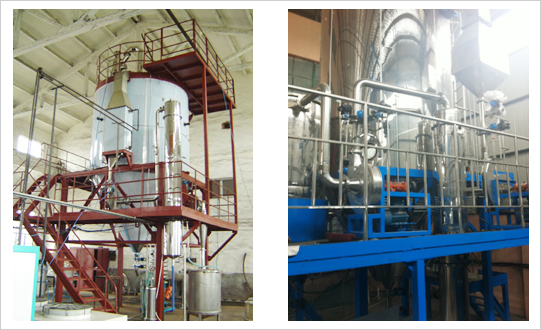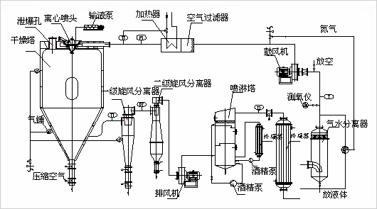首先在干燥塔體內(nèi)充入被加熱的氮?dú)?,被干燥的液態(tài)物料經(jīng)輸液泵輸送至噴頭處,液態(tài)物料被霧化器霧化成細(xì)小液滴,液滴在干燥塔內(nèi)與熱氮?dú)膺M(jìn)行充分的熱交換,物料中的液態(tài)部分被瞬間蒸發(fā),固態(tài)部分形成的粉狀物料沉于塔底,干燥的粉狀物料從塔底排出。其中,被蒸發(fā)的有機(jī)溶劑氣體在風(fēng)機(jī)的作用下,通過(guò)旋風(fēng)分離器、噴淋塔等裝置把附著在氣體中的粉塵進(jìn)行除塵處理,再經(jīng)冷凝器把除塵后飽和有機(jī)溶劑氣體冷凝成液體排出冷凝器。其間,作為干燥介質(zhì)的惰性氣體被連續(xù)加熱后作為干燥載體在系統(tǒng)內(nèi)重新循環(huán)使用。
